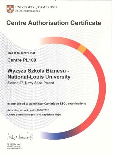 Wyższa Szkoła Biznesu - National-Louis University w Nowym Sączu, jako jedyna uczelnia w Małopolsce, otrzymała uprawnienia do przeprowadzania egzaminów Cambridge KET, PET, FCE, CAE, BEC, ILEC. Egzamin mogą zdawać studenci uczelni lub uczestnicy kursów j. angielskiego.
