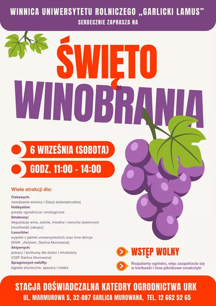 Uniwersytet Rolniczy w Krakowie zaprasza na wyjątkowe Święto Winobrania, które odbędzie się 6 września w godz. 11:00–14:00 w malowniczej winnicy „Garlicki Lamus” przy ul. Marmurowej 5 w Garlicy Murowanej.