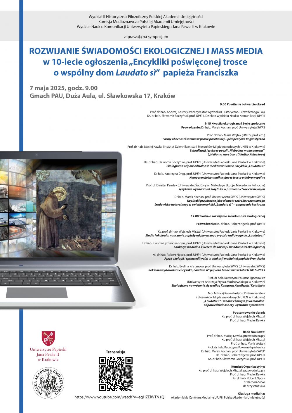 W dniu 7 maja 2025 roku w Gmachu Polskiej Akademii Umiejętności (Duża Aula, ul. Sławkowska 17, Kraków) odbędzie się sympozjum poświęcone roli mass mediów w rozwijaniu świadomości ekologicznej, organizowane z okazji 10. rocznicy ogłoszenia encykliki „Laudato si’” przez papieża Franciszka. Wydział II Historyczno-Filozoficzny PAU, Komisja Medioznawcza PAU oraz Wydział Nauk o Komunikacji UPJPII w Krakowie zapraszają do udziału w wydarzeniu, którego celem jest refleksja nad tym, jak media relacjonowały i kształtowały dyskurs o ochronie środowiska naturalnego.