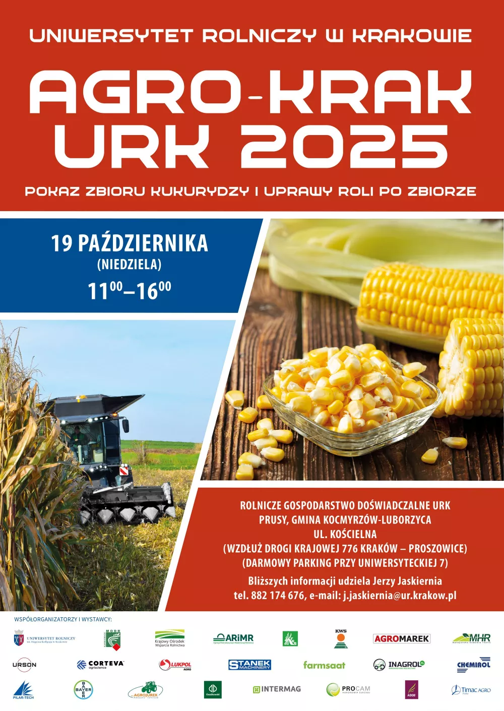 Już w najbliższą niedzielę, tj. 19 października 2025 r., w godz. 11:00–16:00 na terenie Rolniczego Gospodarstwa Doświadczalnego URK w Prusach (gmina Kocmyrzów-Luborzyca), przy ul. Uniwersyteckiej 7 odbędzie się pokaz zbioru kukurydzy i uprawy roli po zbiorze AGRO-KRAK URK 2025.
