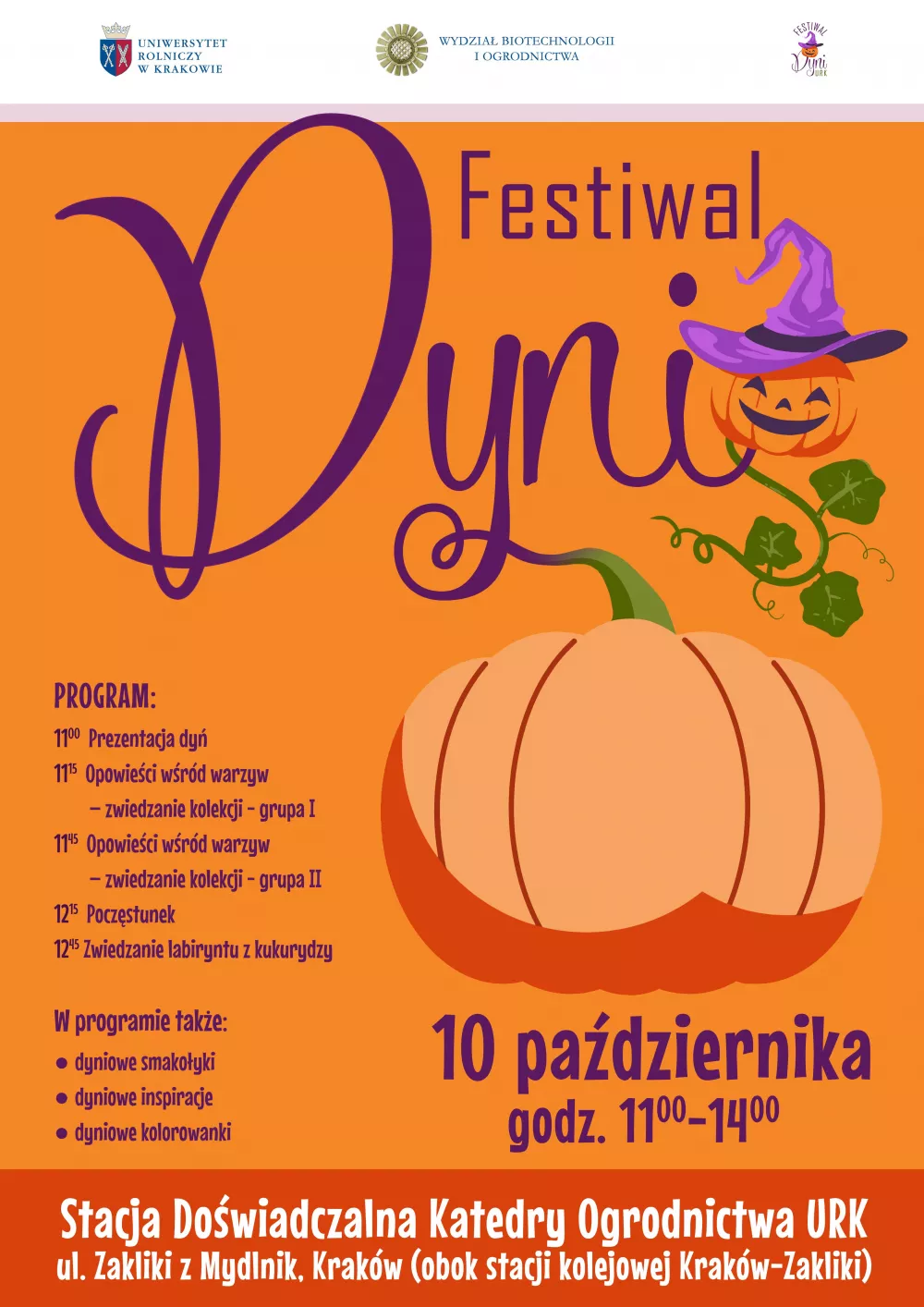Już jutro, tj. 10 października br. w godzinach 11:00–14:00 na terenie Stacji Doświadczalnej Katedry Ogrodnictwa Uniwersytetu Rolniczego w Krakowie, przy ul. Zakliki z Mydlnik w Krakowie (obok stacji kolejowej Kraków-Zakliki) odbędzie się trzeci Festiwal Dyni. Wstęp wolny!