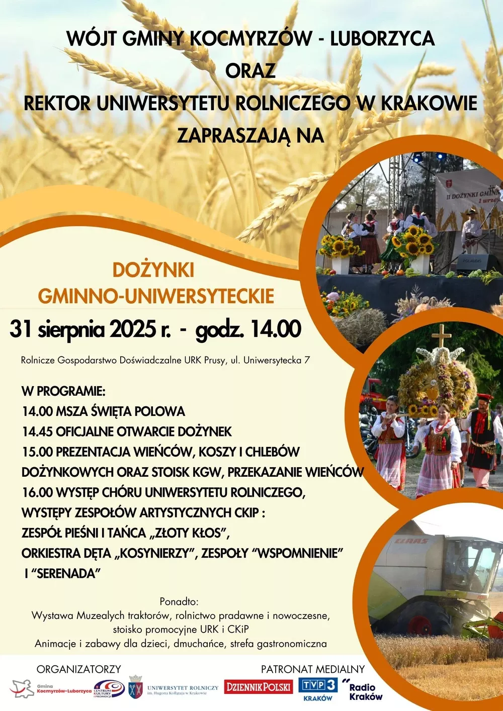 31 sierpnia 2025 roku na terenie Rolniczego Gospodarstwa Doświadczalnego Uniwersytetu Rolniczego w Krakowie w Prusach odbędą się 3. Gminno-Uniwersyteckie Dożynki. Wydarzenie, organizowane przez Gminę Kocmyrzów–Luborzyca oraz Uniwersytet Rolniczy w Krakowie, będzie okazją do podziękowania za tegoroczne plony, pielęgnowania lokalnych tradycji oraz integracji mieszkańców, środowiska akademickiego i samorządowego.