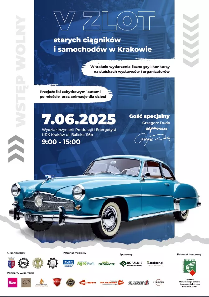 W sobotę, 7 czerwca 2025 r. w godzinach od 9:00 do 15:00, na terenie Wydziału Inżynierii Produkcji i Energetyki Uniwersytetu Rolniczego w Krakowie (przy ul. Balickiej 116B) odbędzie się V Zlot Starych Ciągników i Samochodów.