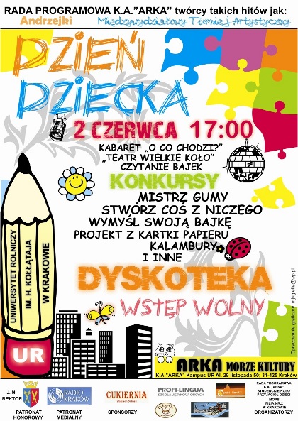 Rada Programowa Klubu Akademickiego "Arka" oraz Studenckie Koło Przyjaciół Dzieci mają zaszczyt zaprosić na pierwszy "Dzień Dziecka w Arce", który odbędzie się 2. czerwca 2009 (wtorek).