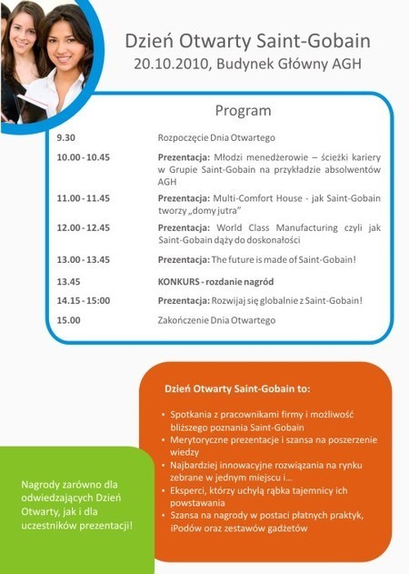 W najbliższą środę, 20 października 2010 roku, w budynku głównym Akademii Górniczo-Hutniczej w Krakowie odbędzie się Dzień Otwarty Saint-Gobain, światowego lidera na rynkach związanych z budownictwem.