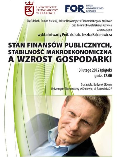 Uniwersytet Ekonomiczny w Krakowie zaprasza studentów oraz mieszkańców miasta Krakowa na otwarty wykład prof. Leszka Balcerowicza pt. "Stan finansów publicznych, stabilność makroekonomiczna a wzrost gospodarki", który odbędzie się w dniu 3 lutego (piątek) o godz. 12.00 w Starej Auli w Budynku Głównym UEK przy ul. Rakowickiej 27.