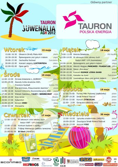 Juwenalia AGH to cykl wydarzeń skierowanych przede wszystkim do studentów oraz całego środowiska akademickiego. W tym roku impreza odbędzie się w dniach 15- 20 maja. Mnóstwo atrakcji przygotowanych przed Akademię Górniczo- Hutniczą we współpracy z Uczelnianą Radą Samorządu Studentów AGH oraz Fundacją ACADEMICA zapewni tysiącom krakowskich żaków porządną dawkę świetnej zabawy.