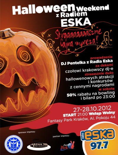 Zapraszamy wszystkich na imprezę Halloweenowy weekend z Radiem Eska i Apeironem. Start o 21. Wstęp wolny. Miejsce: Fantasy Park Kraków