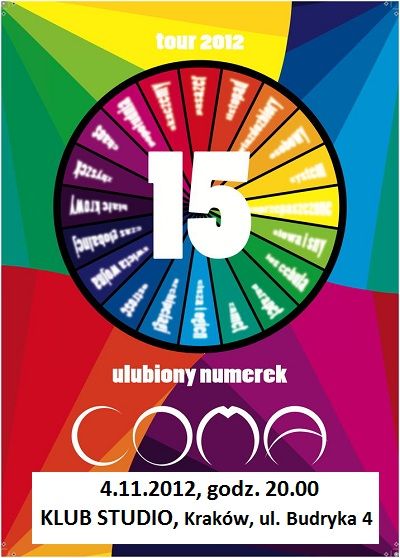 4 listopada(godz.: 20:00, wejście do klubu: 19:00) w krakowskim Klubie Studio (ul. Budryka 4) wystąpi jeden z najpopularniejszych polskich zespołów muzycznych – COMA! Jesienna trasa koncertowa zespołu, to okazja by wraz z łódzką grupą uczcić wspólnie 15 rok ich działalności!