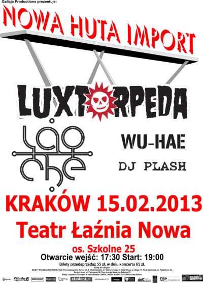 Nowa Huta Import - Luxtorpeda, Lao Che, Wu-hae. Kraków, 15.02.2013 – Teatr Łaźnia Nowa, os. Szkolne 25. Otwarcie wejść: 17:30 Start: 19:00. Bilety przedsprzedaż 55zł, w dniu koncertu 65zł. Bilety VIP miejsce siedzące nienumerowane 80zł ograniczona ilość miejsc).