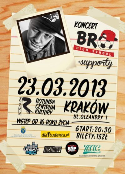Już 23 marca B.R.O po raz drugi wystąpi w Krakowie! Koncert promował będzie najnowszy krążek rapera zatytułowany 'High School', który ukazał się 11 stycznia 2013 nakładem wytwórni UrbanRec.