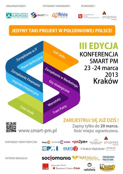 23 - 24 marca 2013 r. już po raz trzeci na Konferencję Smart PM zaprasza Koło Zarządzania Projektami Wyższej Szkoły Europejskiej im. ks. Józefa Tischnera w Krakowie. Konferencja Smart PM to cykl warsztatów z zakresu zarządzania projektami.