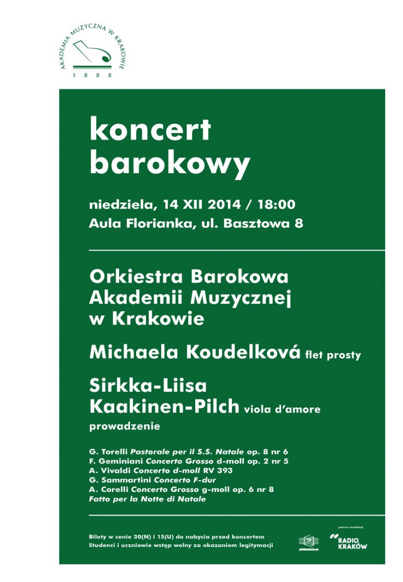 W niedzielę 14 grudnia o godzinie 18:00 wnętrze Auli Florianka (ul. Basztowa 8) wypełni muzyka mistrzów barokowych kompozycji, m.in. Arcangelo Corellego, Giuseppe Torellego i Antonio Vivaldiego. Orkiestrę Barokową Akademii Muzycznej w Krakowie prowadzi znakomita skrzypaczka Sirka-Liisa Kaakinen-Pilch. Bilety w cenie 30zł (N), 15zł (U) do nabycia przed koncertem. Studenci i uczniowie wstęp wolny za okazaniem legitymacji.