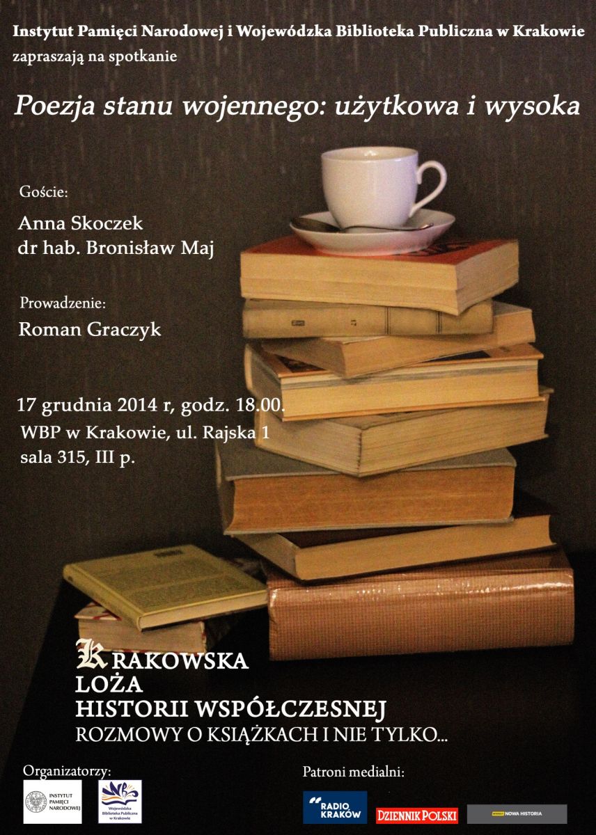 Oddział Instytutu Pamięci Narodowej w Krakowie zaprasza na kolejne spotkanie w nowym sezonie rozmów Romana Graczyka w „Krakowskiej Loży Historii Współczesnej”. Na temat roli poezji w czasie stanu wojennego będą dyskutować Anna Skoczek, autorka książki „Poezja stanu wojennego. Antologia wierszy, piosenek, kontrafaktur, parafraz i fraszek” oraz dr hab. Bronisław Maj. Wiersze czytać będzie Tadeusz Zięba, aktor Teatru im. J. Słowackiego w Krakowie.