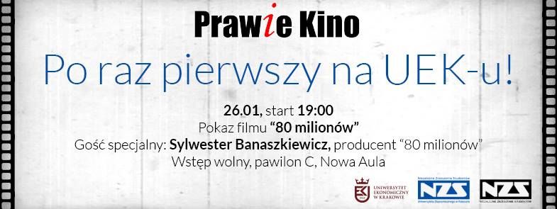 Już 26 stycznia (wtorek) o godzinie 19:00 w Nowej Auli na Kampusie Uniwersytetu Ekonomicznego w Krakowie, projekt „Prawie Kino” NZS UEK będzie gościć producenta filmowego Sylwestra Banaszkiewicza. Spotkanie to będzie poprzedzone projekcją filmu „80 milionów”.