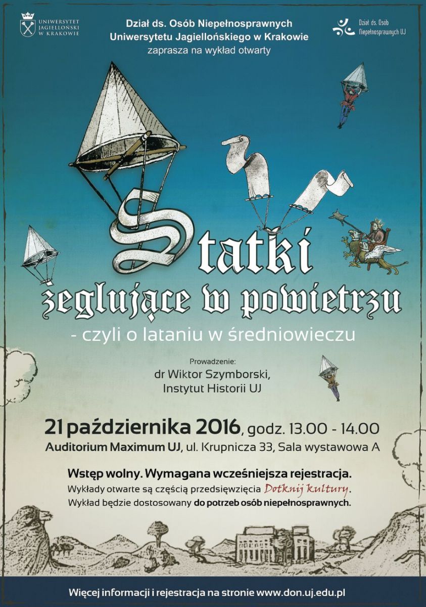 Dział ds. Osób Niepełnosprawnych Uniwersytetu Jagiellońskiego zaprasza na wykład „Statki żeglujące w powietrzu - czyli o lataniu w średniowieczu”, który odbędzie się 21 października o godzinie 13:00 w Auditorium Maximum przy ul. Krupniczej 33 w Krakowie. Spotkanie z dr. Wiktorem Szymborskim z Instytutu Historii UJ zostanie zaadaptowane do potrzeb osób z niepełnosprawnościami.