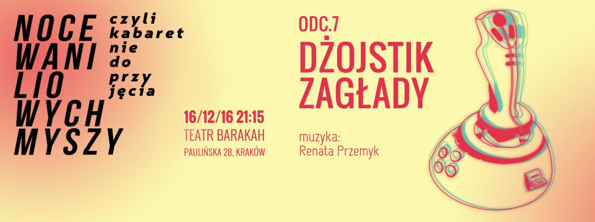 "Dżojstik zagłady" to połączenie szpiegowskiej farsy i tajemniczej podróży w osobliwe realia psychiki szaleńca opętanego władzą i swoimi własnymi słabościami. Poza widowiskowością, zwariowanym tempem, muzyką i salwami śmiechu, czeka Was również okazja do refleksji nad współczesną relacją pomiędzy obywatelem i rządzącymi. W onirycznej, komediowej materii ujrzycie zniekształcone odbicie współczesności, w której zręczne oko bez problemu odnajdzie pierwowzory… Jak uratować Polskę? Czy światem rządzą siły, o których nie wiemy? Czy kobiety lecą tylko na wysoko postawionych? Czy, żeby się wspiąć, trzeba coś zdjąć? A przede wszystkim: co zrobić, żeby nie musieć żyć w ciekawych czasach? - Na te i więcej pytań odpowiada siódmy odcinek Nocy Waniliowych Myszy Teatru Barakah.
