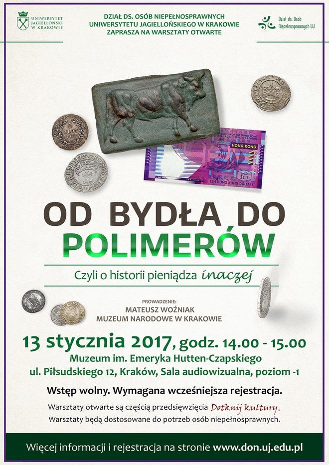 Żeby dobrze poznać monetę czy banknot trzeba je wziąć do ręki. Oglądanie na ekranie komputera czy zza szyby muzealnej gabloty, nie dostarcza pełni wrażeń wynikających z obcowania z obiektem, który po to został stworzony, by przechodził z rąk do rąk. Dlatego też spotkanie będzie miało charakter warsztatów, w czasie których będzie możliwość bliższego zapoznania się z "wagą" czy nawet "zapachem" pieniądza.