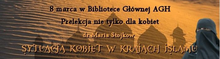 Akademia Górniczo-Hutnicza zaprasza na wykład dr Marii Stojkow "Sytuacja kobiet w krajach islamu", który odbędzie się 8 marca o godzinie 12:00 w Czytelni Książek Własnych Biblioteki Głównej AGH.