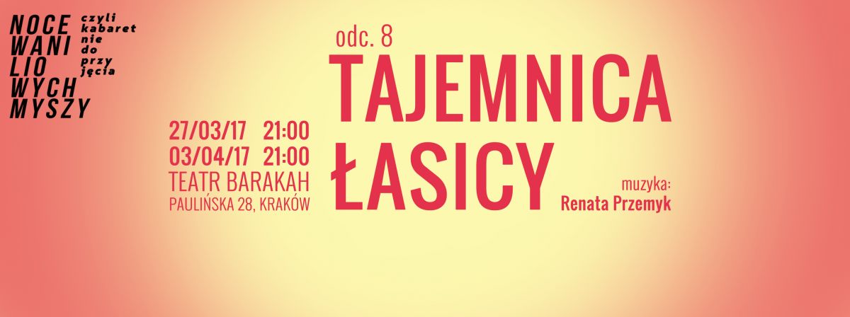 Premiera nowego, ósmego odcinka Nocy Waniliowych Myszy pt. "Tajemnica Łasicy" odbędzie się 27 marca o 21:00 w Teatrze Barakah przy Paulińskiej 28 w Krakowie.