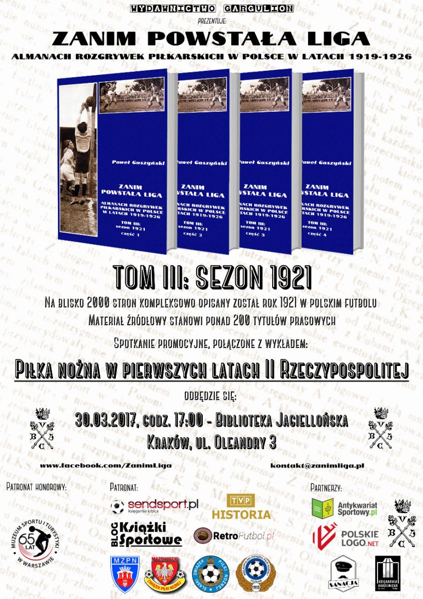 Promocja książki "Zanim powstała liga. Almanach rozgrywek piłkarskich w Polsce w latach 1919-1926. Tom III: Sezon 1921" oraz wykład "Piłka nożna w pierwszych latach II Rzeczypospolitej" odbędzie się 30 marca w Bibliotece Jagiellońskiej.