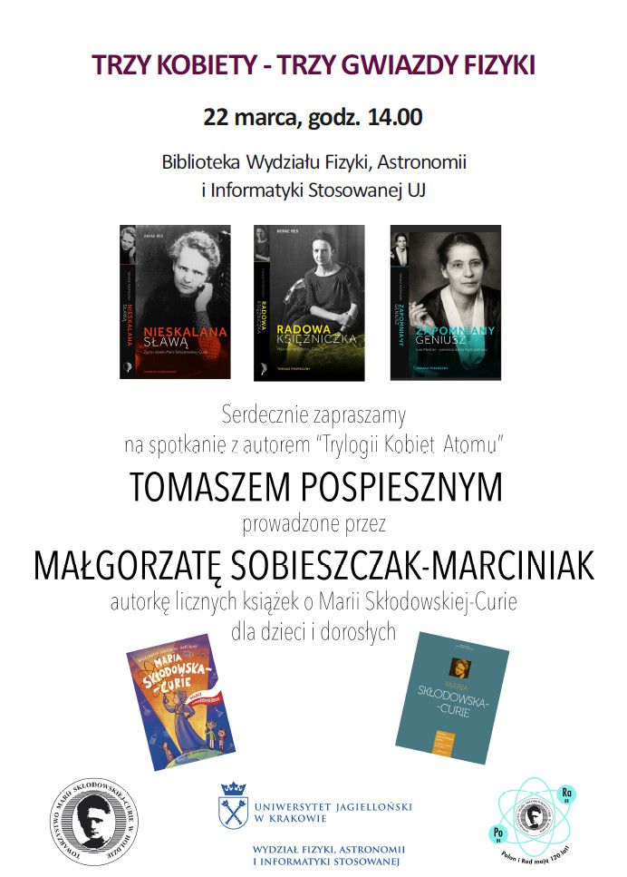 Trzy Kobiety - Trzy Gwiazdy Fizyki to tytuł spotkania, które odbędzie się 22 marca o godzinie 14:00 w Bibliotece Wydziału Fizyki, Astronomii i Informatyki Stosowanej Uniwersytetu Jagiellońskiego.