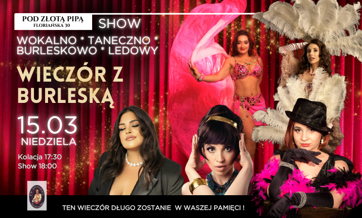 Czeka na Was: pyszna kolacja w naszych klimatycznych wnętrzach wyłącznie dla osób dorosłych wyjątkowy show, który łączy burleskę, taniec kabaretowy, broadway jazz, sexy dance i orientalne akcenty piękne tancerki, utalentowani wokaliści i widowiskowe LED-owe efekty