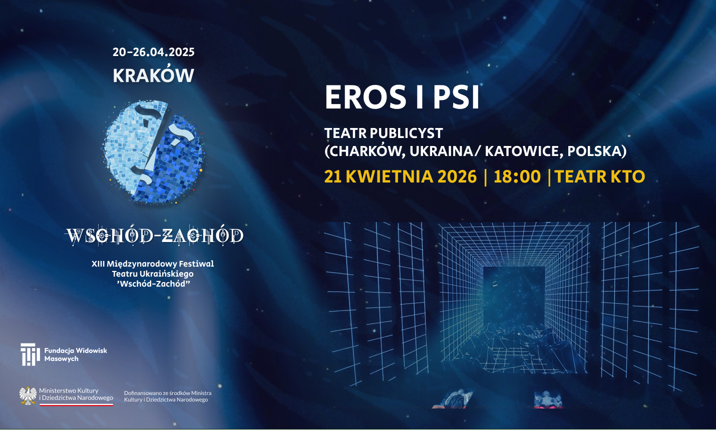 „Eros i Psi” to ukraiński spektakl performatywny wyrastający z doświadczenia wojny, stawiający pytanie: kiedy to się skończy i czy można to zrozumieć językiem nauki lub sztuki? Przedstawienie opowiada o utracie oparcia w świecie, w którym zawodzą religia i ideologie, a człowiek musi na nowo definiować sens, odpowiedzialność i nadzieję. Twórcy łączą mitologię antyczną z matematyką, filozofią i osobistym doświadczeniem, tworząc performatywno-muzyczną formę z elementami teatru fizycznego. Warstwa wizualna wykorzystuje grafikę generatywną i sztuczną inteligencję. Spektakl powstał w 2025 roku w koprodukcji międzynarodowej.