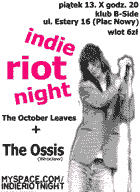 Lepsza, większa i głośniejsza Indie Riot Night powraca po wakacjach! Tym razem prezentujemy The Ossis i October Leaves - dwa młode, ambitne, polskie zespoły świetnia wpisujące się w tradycję brit popu i rock'n'rolla. Po koncercie jak zawsze zabawa do wczesnych godzin porannych przy piosenkach The Libertines, Smiths, The Rapture, Muse, Klaxons i wielu, wielu innych.