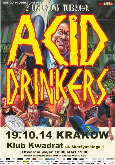 Koncert Acid Drinkers w Krakowie, promujący ich najnowszy album „25 Cents For a Riff”, w ramach ogólnopolskiej trasy koncertowej „25 Upside Down” odbędzie się 19 października! „25 Upside Down” jest nawiązaniem zarówno do najnowszej płyty, jak i 25-lecia zespołu, które Acid Drinkers obchodzi w tym roku. Nadszedł czas na świętowanie ćwierćwiecza w klubach, gdzie zanika dystans między muzykami, a fanami.