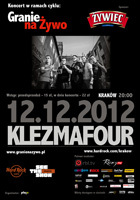 Granie Na Żywo Klezmafour Data: 12.12.2012 Miejsce: Hard Rock Cafe Kraków, Plac Mariacki 9 Start: 20:00 Wstęp: 15 zł (przedsprzedaż) / 22 zł (w dniu koncertu) Grupa Klezmafour zaprezentuje się w Hard Rock Cafe Kraków już 12 grudnia. Będzie to kolejne wydarzenie w ramach cyklu Granie Na Żywo.