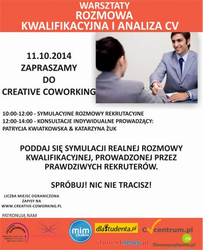11.10.2014 zapraszamy do Creative Coworking. Poddaj się symulacji realnej rozmowy kwalifikacyjnej, prowadzonej przez prawdziwych rekruterów. Spróbuj! Nic nie tracisz.