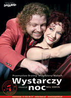Wielbicieli piosenki i musicali zapraszamy na spektakl „Wystarczy noc” z udziałem Magdy Walach i Przemka Brannego. Ona - Sonia Walsk - początkująca autorka tekstów, nieco afektowana, ekscentryczna romantyczka. On - Vernon Gersch - to uznany kompozytor popularnych piosenek, zdobywca nagród, pewny siebie, trochę cyniczny pracoholik. Razem mają pracować nad albumem. Podczas pracy rodzi się ich wzajemna fascynacja, która szybko zamienia się w miłość.